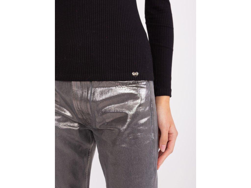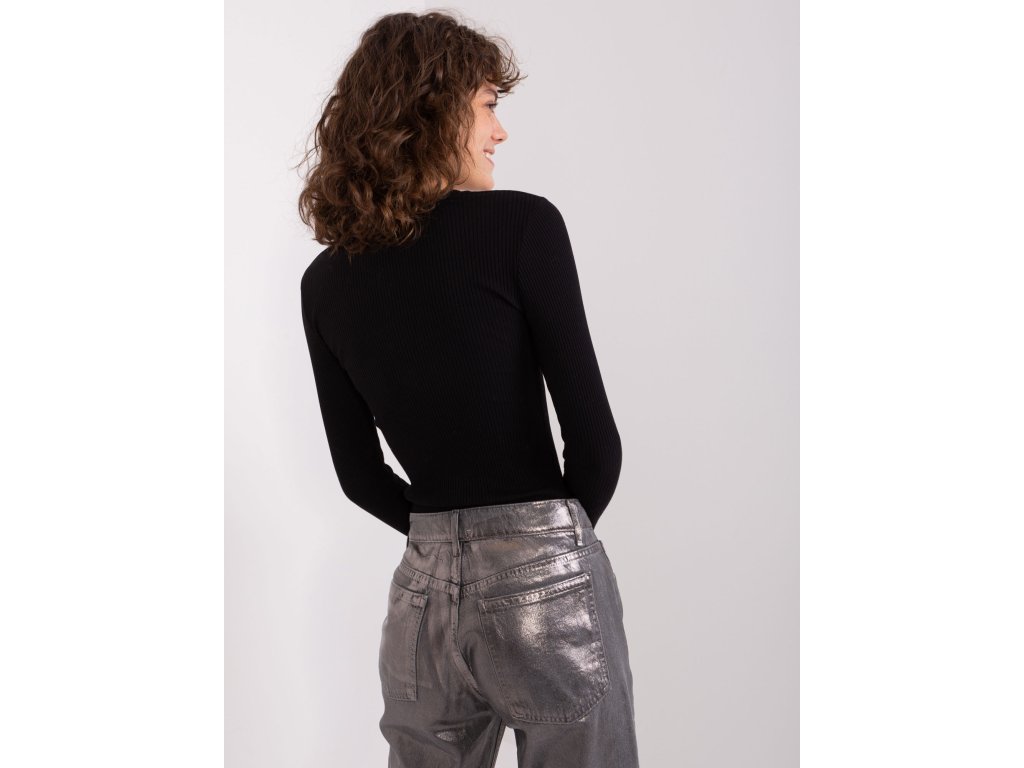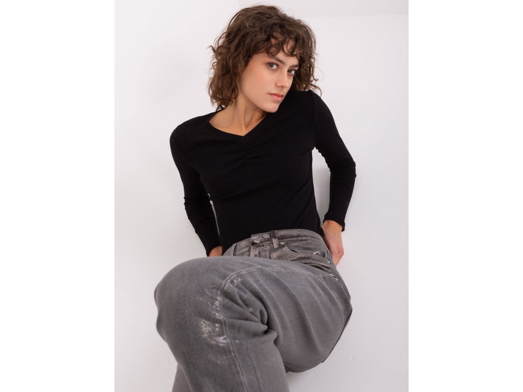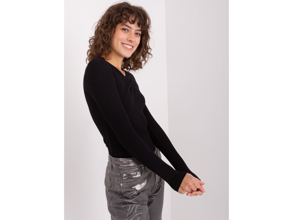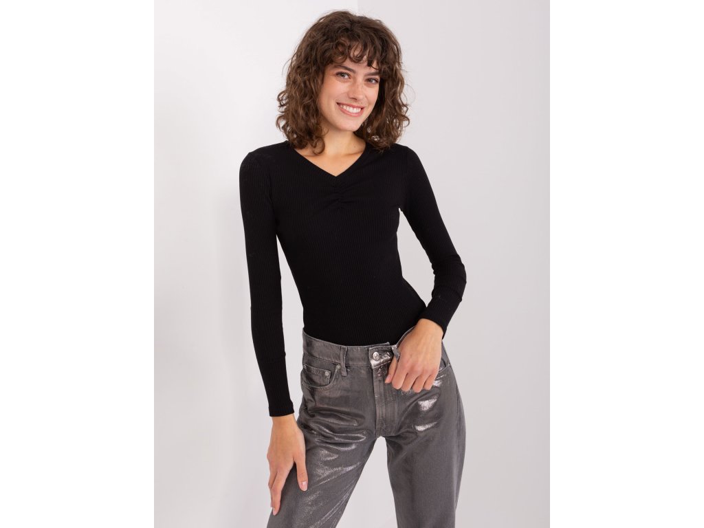 Černá žebrovaná základní blůza s dlouhým rukávem a výstřihem do V