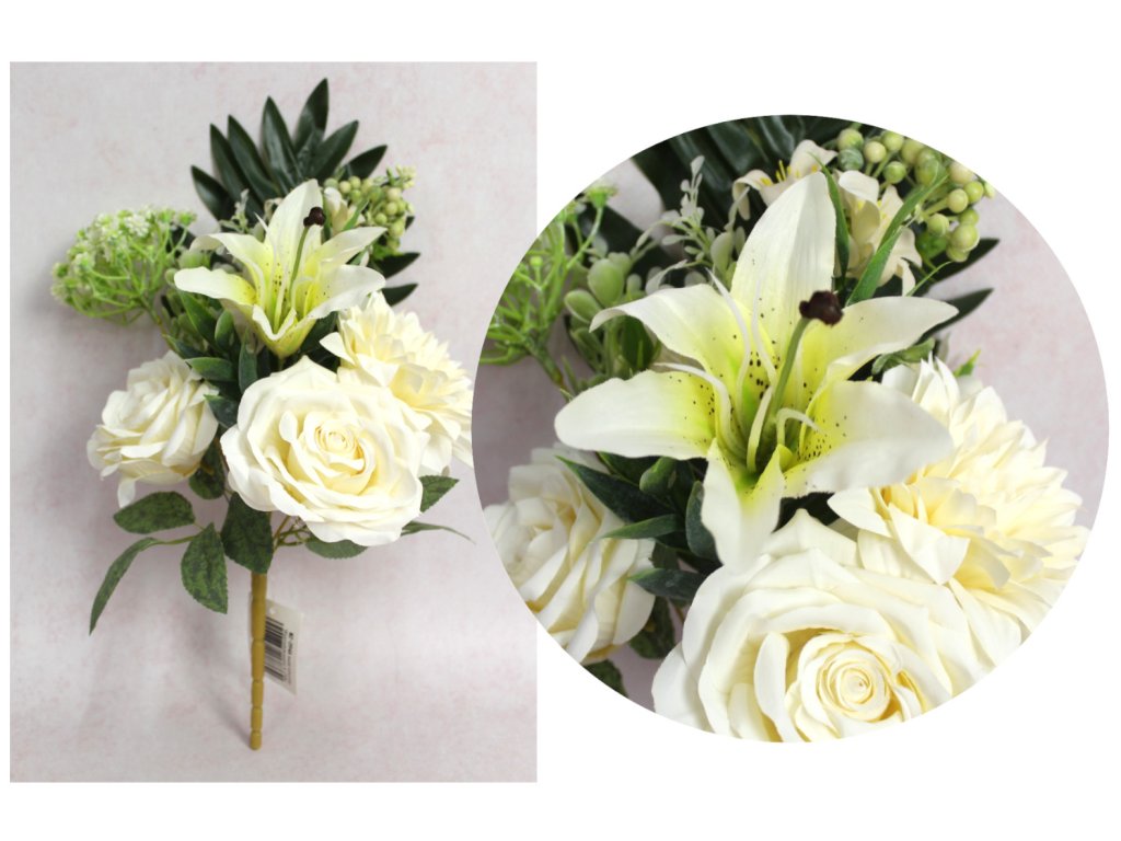 Smíšená kytice RŮŽE, LILIE, DALIE výška 42 cm 7 stonků (hlávky 5-13 cm) BÍLÁDoplňkové parametry