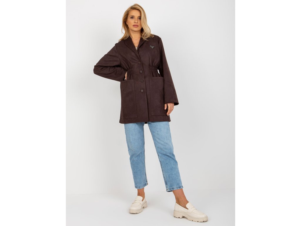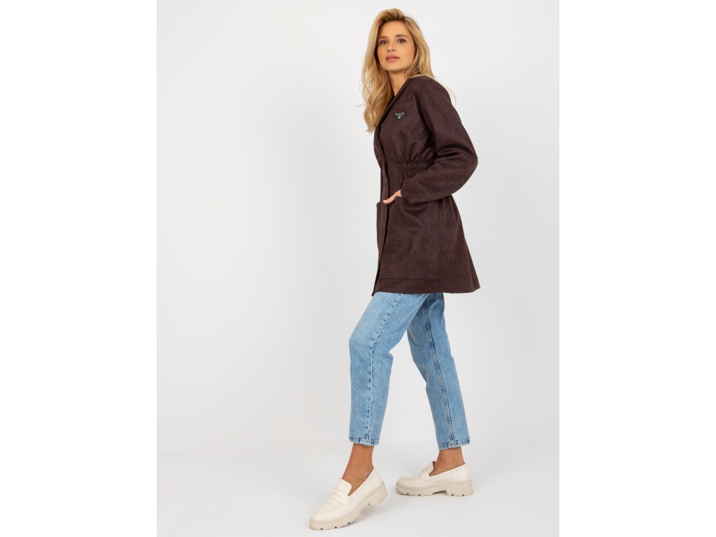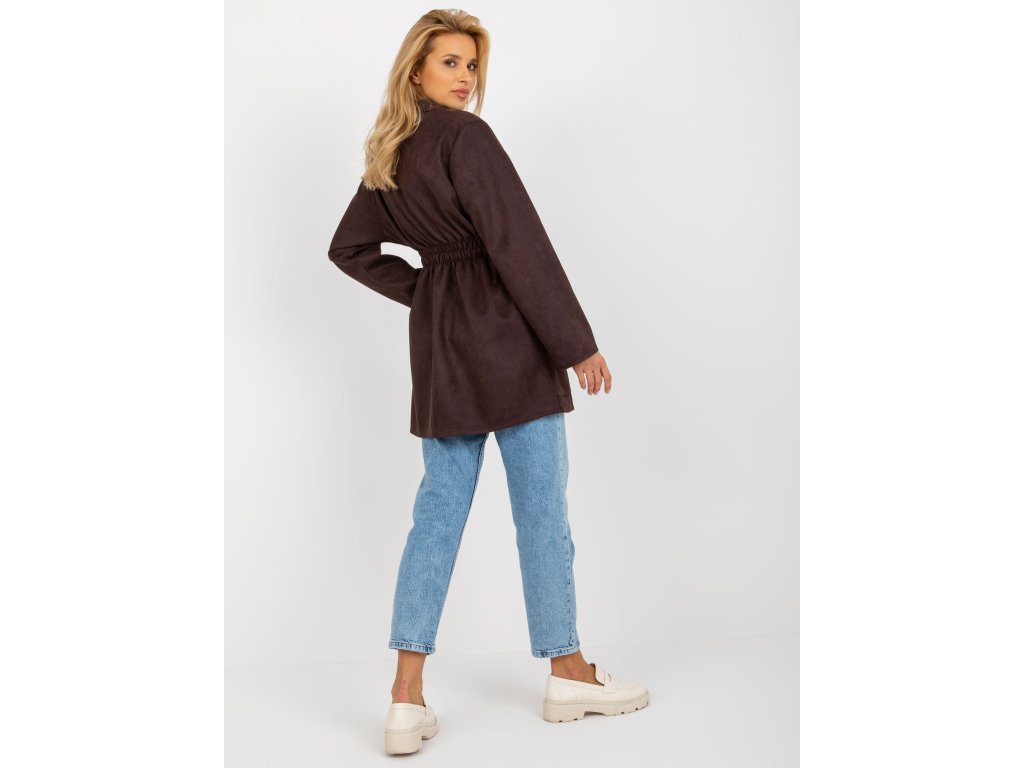 Tmavě hnědý kabát s elastickým páskem v pase.