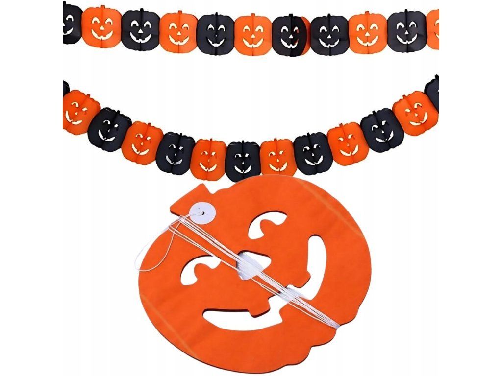 Girlanda je poutavá dekorace, ideální pro Halloween. Je vyrobena z papíru, zobrazuje vzory dýně a pavouka a dodá temnou atmosféru každé oslavě nebo výzdobě interiéru k této příležitosti. Girlanda má délku 3 metry, takže je ideální k zavěšení na zeď, nad dveře, okna nebo kamkoli jinam, kde chcete vytvořit halloweenskou atmosféru.