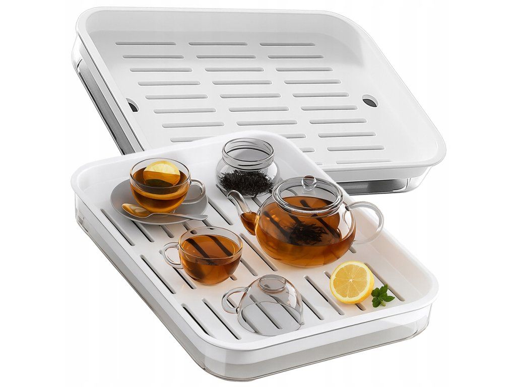 Podnos je vybaven vyjímatelnou perforovanou vložkou, která umožňuje volný odtok vody po umytí nádobí nebo ovoce. Spodní část podnosu zachycuje přebytečnou vodu, takže pracovní deska zůstává suchá a čistá. Je to ideální řešení pro sušení šálků, talířů nebo příborů bez nutnosti používat velké odkapávače.