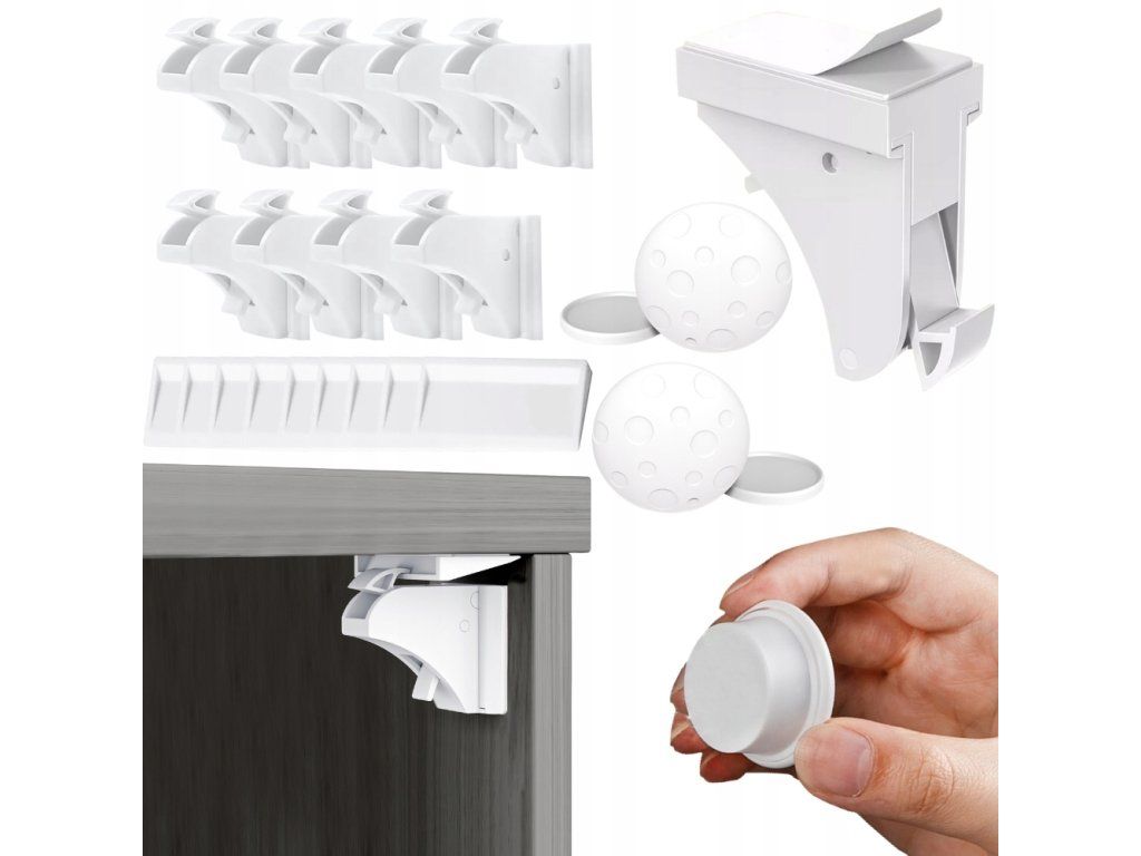 Sada 10 magnetických zámků je spolehlivou ochranou proti nechtěnému otevírání skříní a zásuvek dětmi. Zámky fungují pouze při použití speciálního magnetického klíče - tím zabráníte tomu, aby si dítě mohlo samo otevřít dvířka. Jedná se o účinnou ochranu nejen před nepořádkem, ale především před nebezpečnými předměty v kuchyni, koupelně nebo obývacím pokoji.