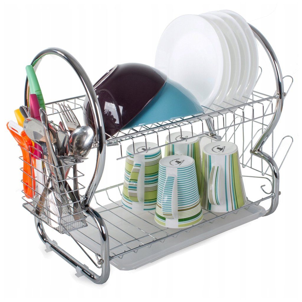 Dvouúrovňový sušák na nádobí je nezbytným vybavením každé kuchyně. Je velmi praktický, má dvě úrovně, které pojmou velké množství talířů, misek a sklenic. Kromě toho má dva závěsné držáky. Jeden na příbory a druhý na sklenice.
