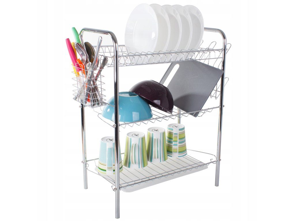 Tříúrovňový odkapávač na nádobí je nezbytnou součástí vybavení každé kuchyně. Je velmi praktický, díky třem úrovním pojme velké množství talířů, misek a sklenic. Kromě toho má dva závěsné držáky. Jeden na příbory a druhý na prkénka.