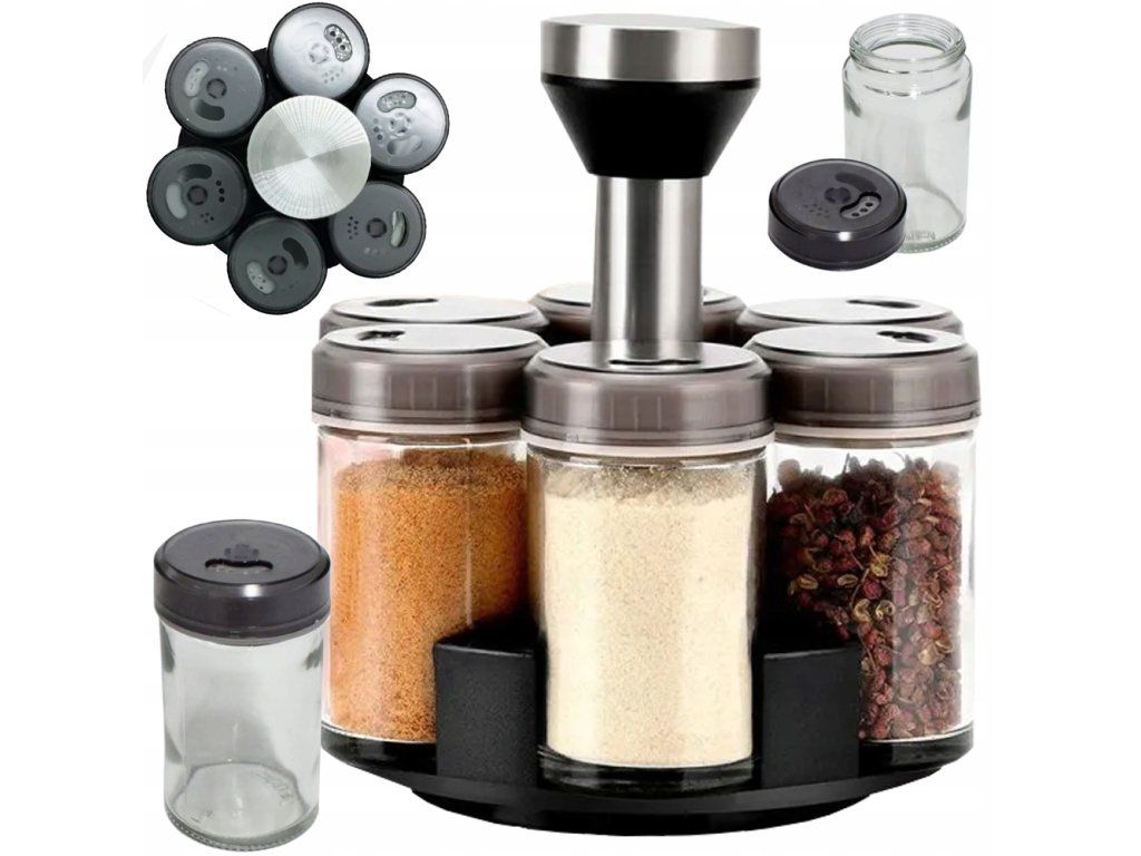 Nářadí je vybaveno otočným stojanem, který umožňuje snadný přístup ke všem oblíbeným kořením. Snadno tak najdete koření, které při vaření potřebujete.
