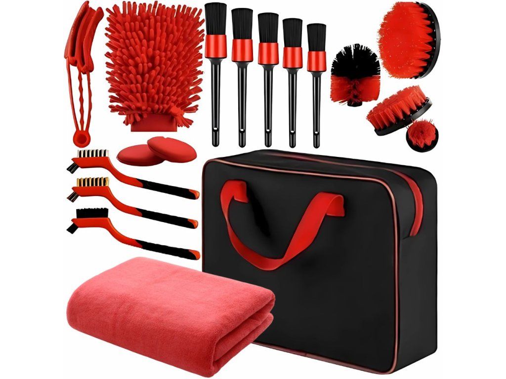 Sada obsahuje různé kartáče, detailní kartáče, podložky, hadříky, rukavici z mikrovlákna a mnoho dalšího příslušenství. S jejich pomocí můžete účinně vyčistit zákoutí, odstranit nečistoty a navrátit svému vozu výstavní lesk.