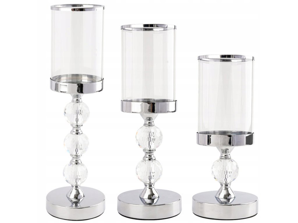Každý svícen má jinou velikost, což umožňuje jejich efektivní uspořádání do kompozice na stole, komodě nebo konzole. Skleněné kryty chrání plamen svíčky a rozptylují světlo, čímž vytvářejí útulnou, romantickou atmosféru. Kulovité prvky s křišťálovou texturou odrážejí světlo a září jeho září.