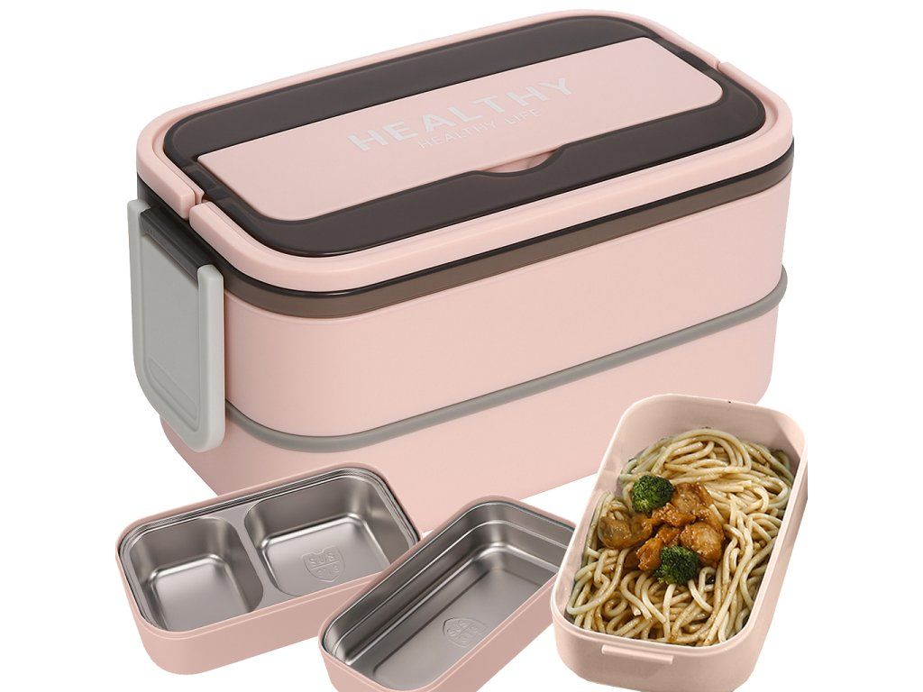 Svačinový box dvoupatrový s příborem, 1400 ml, růžová