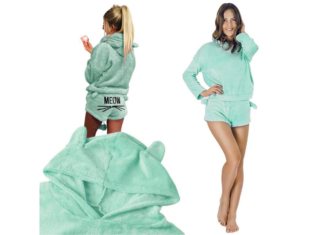 Teplé dámské pyžamo s kapucí, plyšové, vel. XL, modrá
