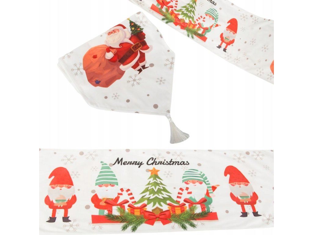 Je vyroben z vysoce kvalitního materiálua zdobí ho krásný vzor s vyobrazením Santa Clause, dárků a vánočního stromečku. Je zakončen nápadnými střapci.