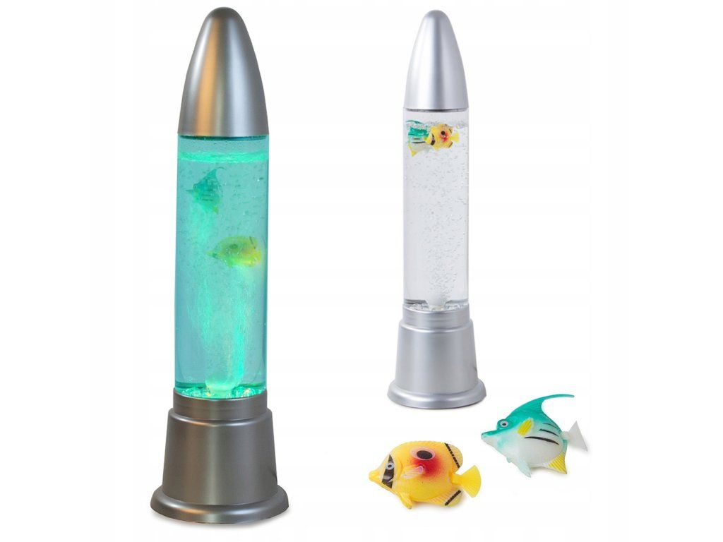 Lávová lampa mění barvy světla a rybičky vytvářejí dojem vzduchových bublin, které se vznášejí kolem, a přinášejí tak klid a harmonii.