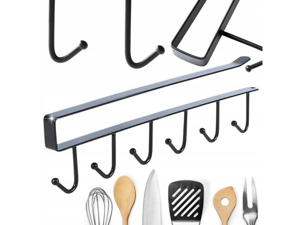 Věšák má 6 robustních háčků, které jsou ideální pro zavěšení lžic, špachtlí, nožů, kuchyňských rukavic nebo naběraček. Jednoduchá instalace bez vrtání umožňuje jeho upevnění pod polici nebo skříňku. Matná černá barva se hodí k většině moderních kuchyní a doplňků.